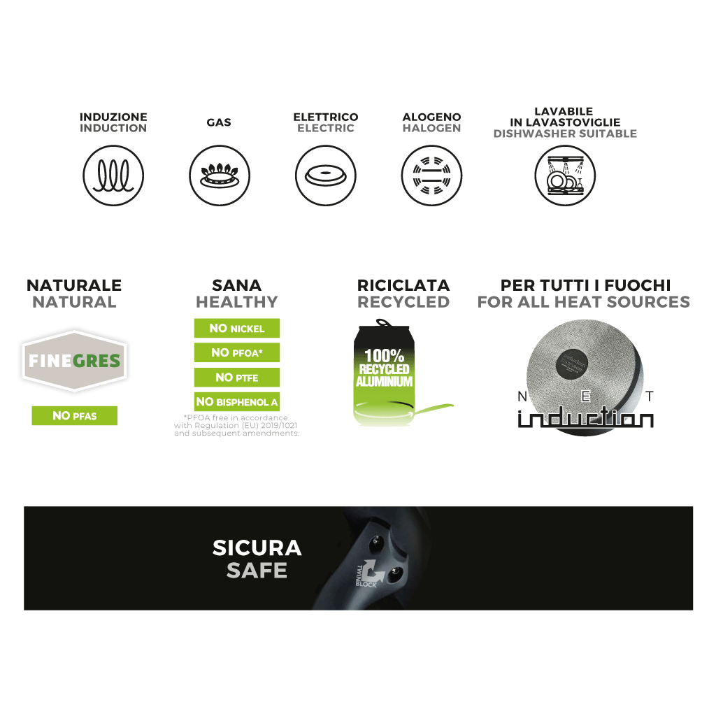 Rivestimento antiaderente naturale, realizzato con materiali inorganici e solventi naturali. Resistente alle alte temperature e privo di PTFE, PFOA, Nichel e Bisfenolo A.