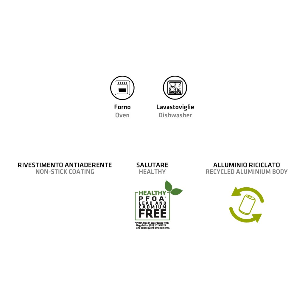 Artech: il rivestimento antiaderente Artech esalta il sapore naturale dei cibi. Il corpo in alluminio permette un’ottimale diffusione del calore, conservando così il vero gusto delle pietanze. Grazie all’eccezionale antiaderenza di ARTECH è possibile ottenere una cottura sana e leggera, senza olio né grassi. No PFOA, No Nichel, No Bisfenolo A. Colore argento.