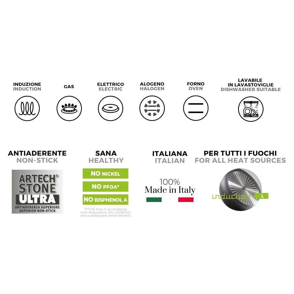 Artech Stone Ultra: ultimo nato tra i rivestimenti Moneta, per una antiaderenza superiore. Artech Stone Ultra è il rivestimento effetto pietra dalla superficie ruvida per chi desidera una pentola che non teme le maniere forti. Ottimo per cotture veloci, uniformi e senza grassi, molto resistente ai graffi e alle abrasioni. Artech Stone Ultra si avvale di un’antiaderenza a triplo strato. No PFOA, No Nichel, No Bisfenolo A.