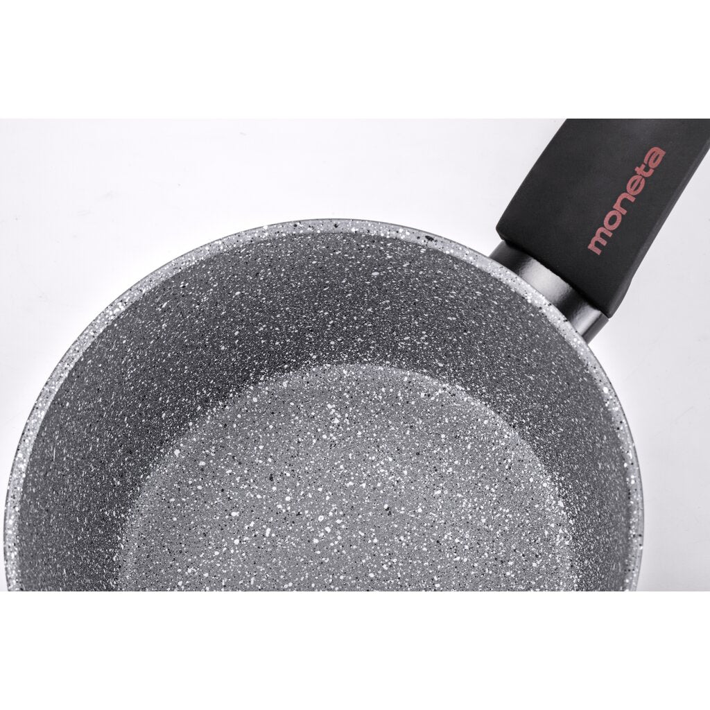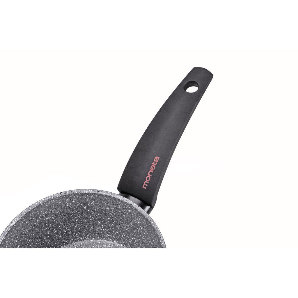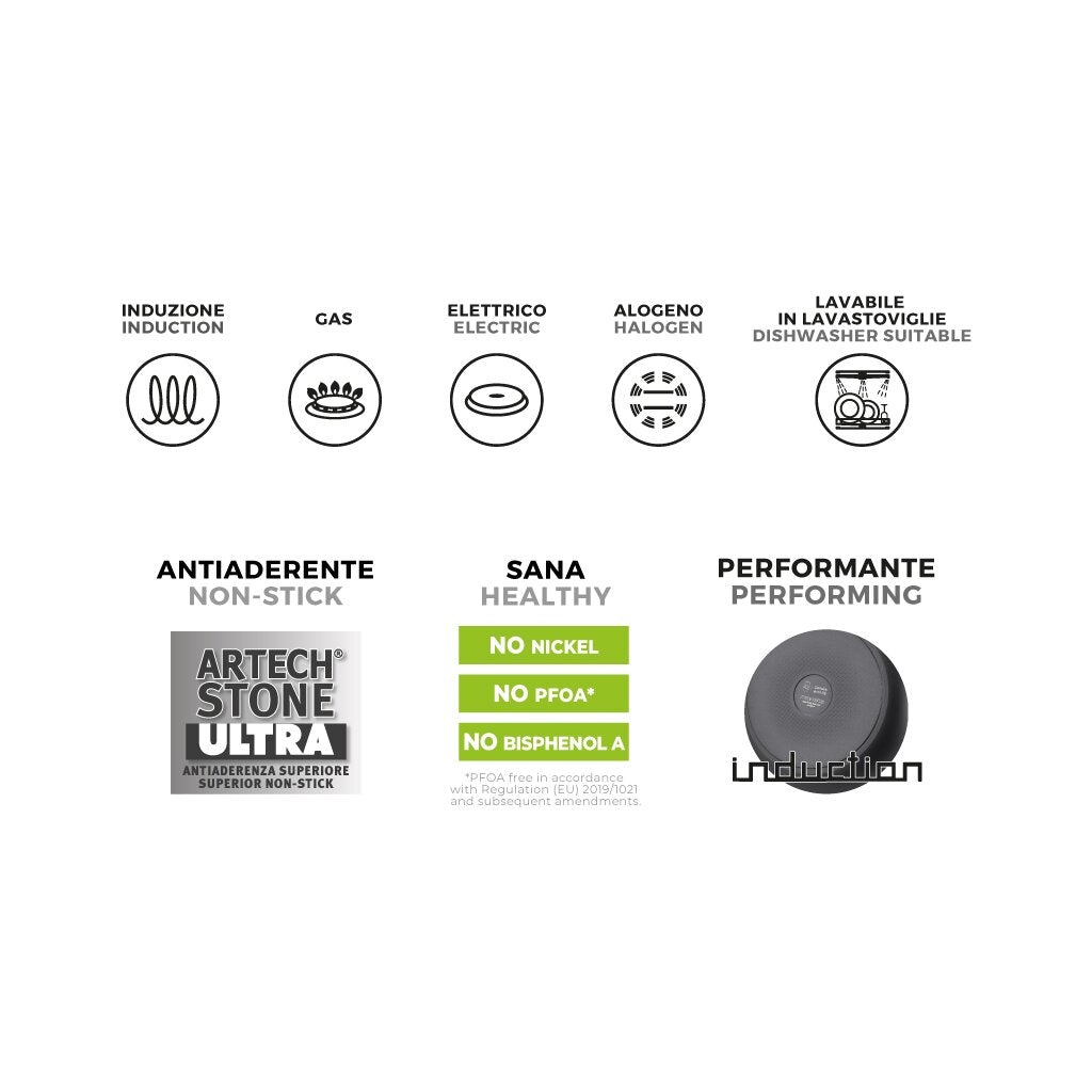 Artech Stone Ultra: ultimo nato tra i rivestimenti Moneta, per una antiaderenza superiore. Artech Stone Ultra è il rivestimento effetto pietra dalla superficie ruvida per chi desidera una pentola che non teme le maniere forti. Ottimo per cotture veloci, uniformi e senza grassi, molto resistente ai graffi e alle abrasioni. Artech Stone Ultra si avvale di un’antiaderenza a triplo strato. No PFOA, No Nichel, No Bisfenolo A. Colore grigio.