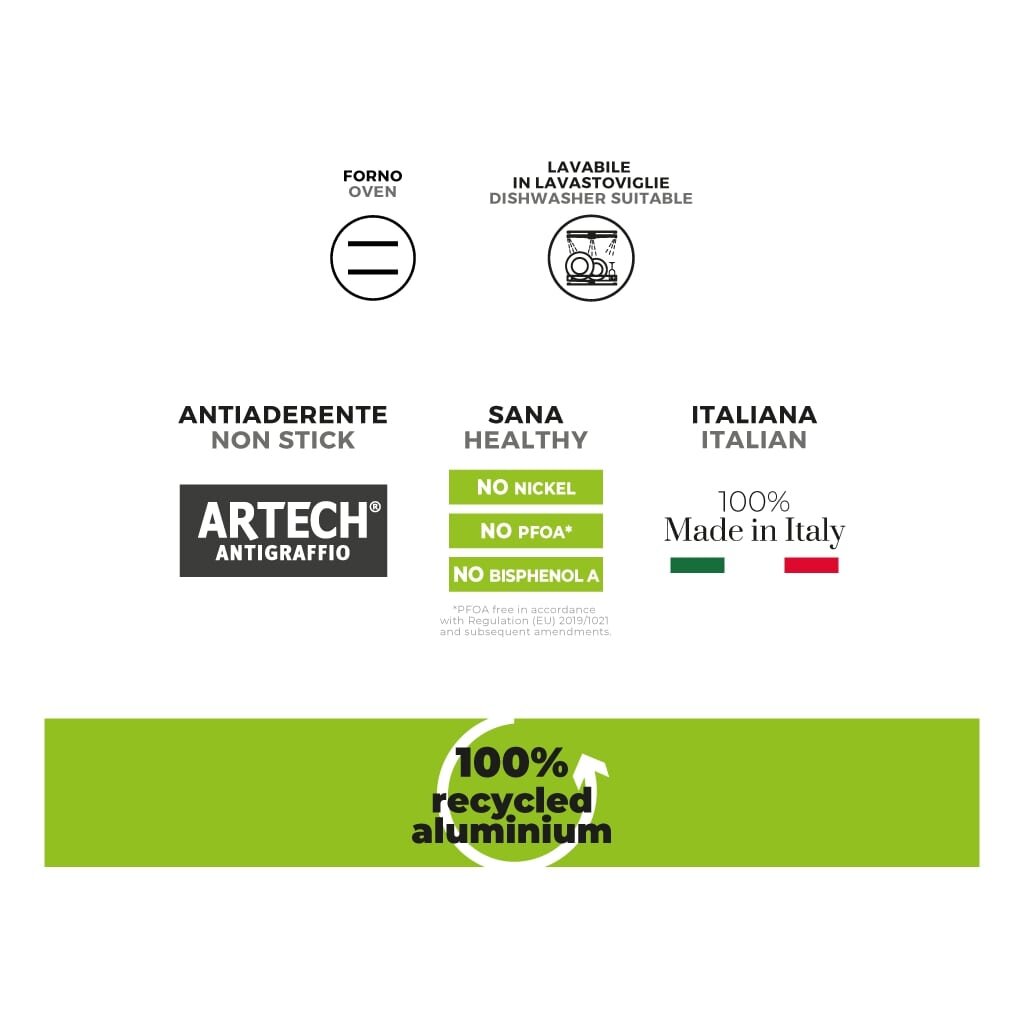 Artech: il rivestimento antiaderente che valorizza il sapore naturale dei cibi. Grazie all'eccezionale antiaderenza di Artech, è possibile ottenere una cottura sana e leggera, senza l'uso di olio o grassi.Privo di PFOA, nichel e bisfenolo A, per una sicurezza totale e il massimo rispetto per la salute.
