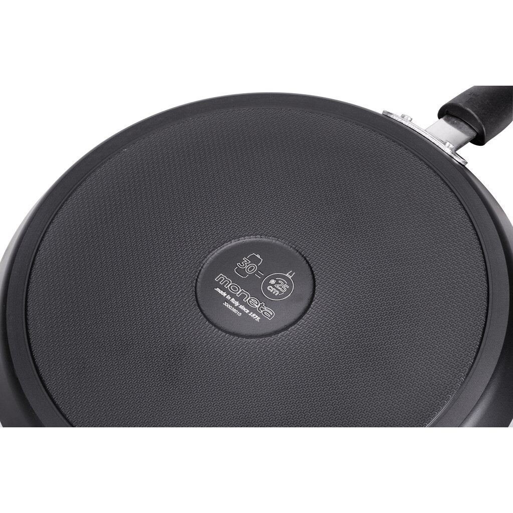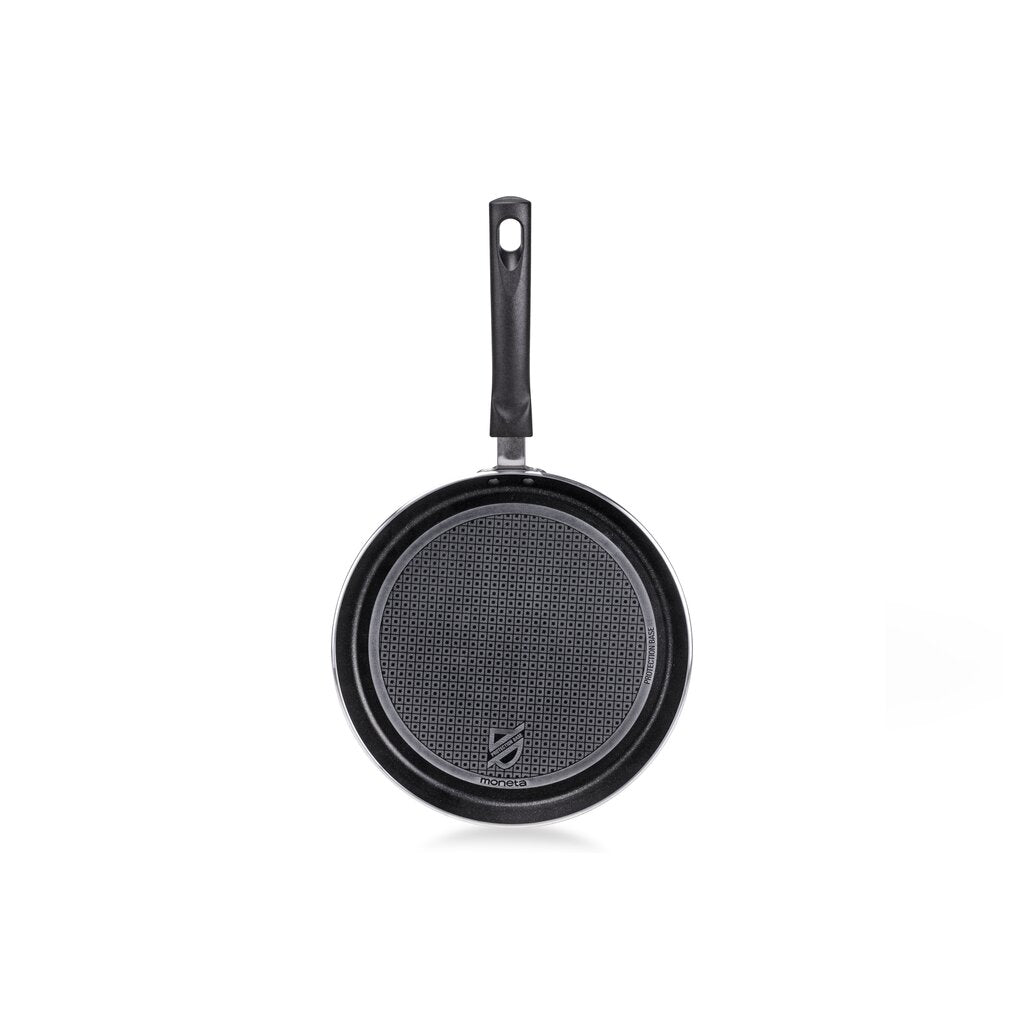 Rivestimento Protection Base: uno scudo per la tua pentola; è il sistema di applicazione brevettato Moneta che garantisce doppia durata e resistenza dell’antiaderenza.Durante la verniciatura viene aggiunta una tecno-superficie intermedia sulla base antiaderente e un ulteriore strato protettivo con micro-cristalli in grado di rinforzare e sigillare l’intera superficie. No PFOA, No Nichel, No Bisfenolo A.